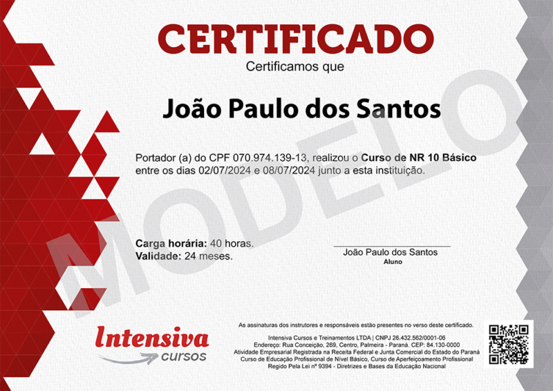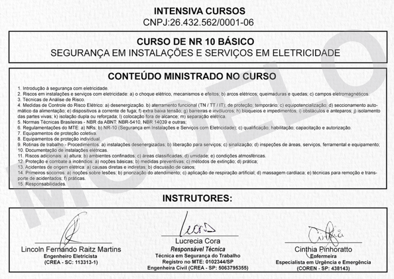 O conteúdo do Curso de NR 10 Básico da Intensiva Cursos foi elaborado por profissionais das áreas de Engenharia Elétrica (Engenheiro Eletricista), Segurança no Trabalho (Técnica em Segurança no Trabalho) e Saúde/Primeiros Socorros (Enfermeira intensivista).