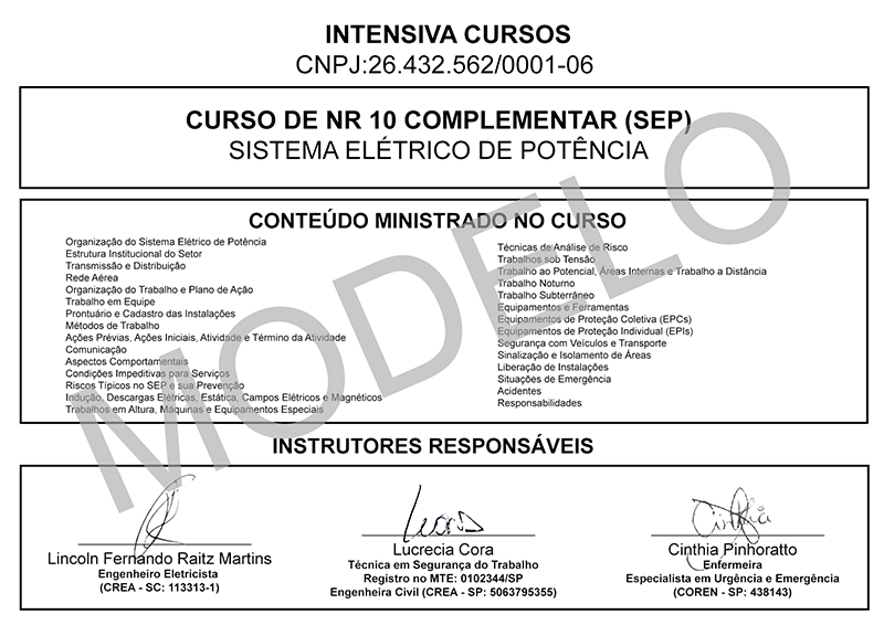 O conteúdo do Curso de NR 10 SEP da Intensiva Cursos foi elaborado por profissionais das áreas de Engenharia Elétrica (Engenheiro Eletricista), Segurança no Trabalho (Técnica em Segurança no Trabalho) e Saúde/Primeiros Socorros (Enfermeira intensivista).