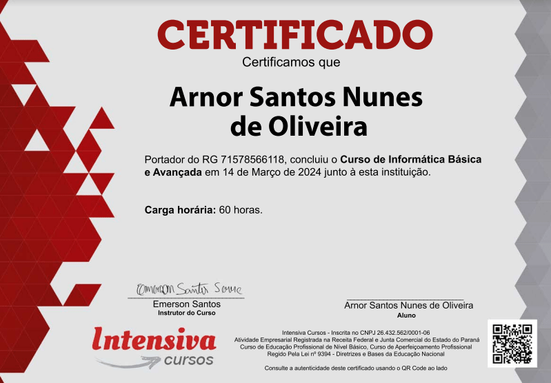 Certificado de Informática Básica e Avançada – Arnor Santos Nunes de Oliveira✅ Certificado Válido conforme imagem abaixo: