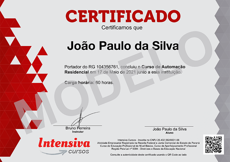 Modelo do Certificado do Curso de Automação Residencial – Frente